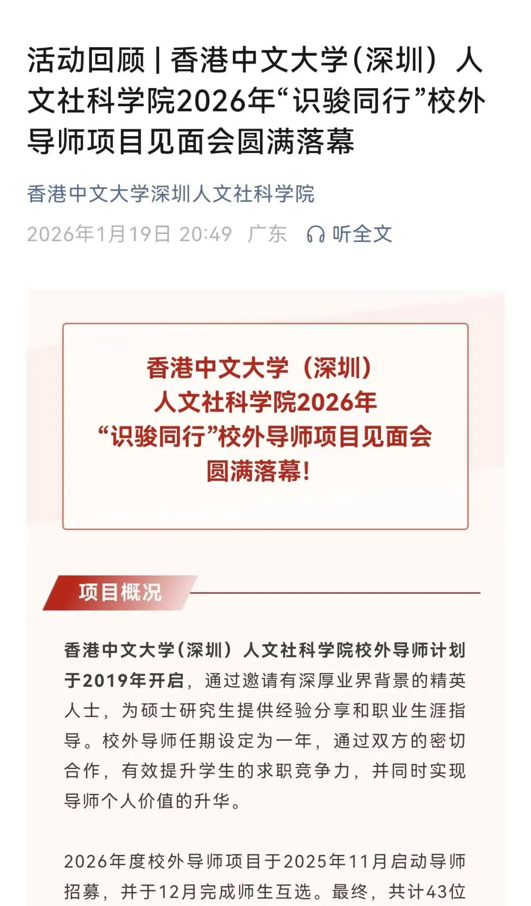 识骏同行,博文约礼。近日,香港中文大学(深圳)人文社科学院举办校外导师项目见面会。知识空间创始人黄伟先生获聘为校外导师,参与该院计算社会科学硕士项目的学生辅导,帮助学生构建职业认知,提升实践竞争力抓牛网,助力这所世界名校深化产教融合、优化育人体系。